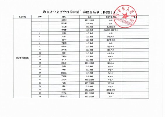 • 海南省公立醫療機構特需門診醫生名單(特需門診)